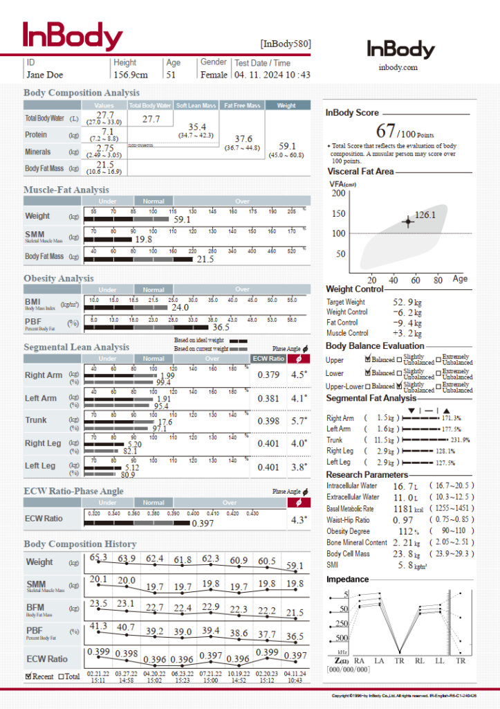 Vaihtoehtoiset sisällöt: InBody-pisteet, Painokontrolli, Viskeraalirasva, Ravitsemustilan arviointi, Painon arviointi, Kehon tasapainon arviointi, Segmentaalinen ympärysmitta, Vartalotyyppi, Vyötärö-lantio-suhde, Segmentaalinen rasvadiagnoosi, Segmentaalinen vesidiagnoosi, Segmentaalinen ICW-analyysi, Segmentaalinen ECW-analyysi